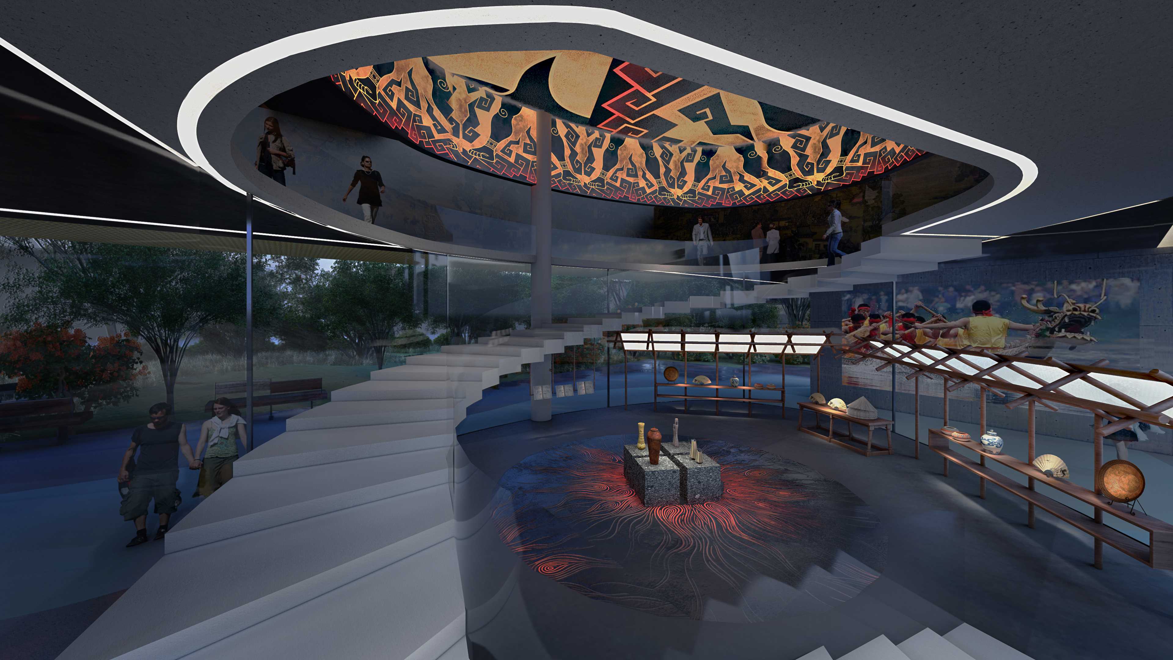 下渚湖湿地“墩岛散布湖面、港汊交错纵横”,传说中防风氏“一脚踩出下渚湖”,因此有了 “地裂防风国,天开下渚湖” 的传言。我们将此历史文化和地理风貌作为设计立意,将美好的传说和风景融入文化中心的建筑、室内和景观设计。通过整体的设计,将非遗展厅、活动室、志愿者活动站、室外场地、健身步道等功能做了生动的串联,隐喻下渚湖灵动的湖水。将展览空间和市井活动进行衔接和互动,寓意古今对话,将下渚湖地区的非遗文化亲切融入百姓日常生活。