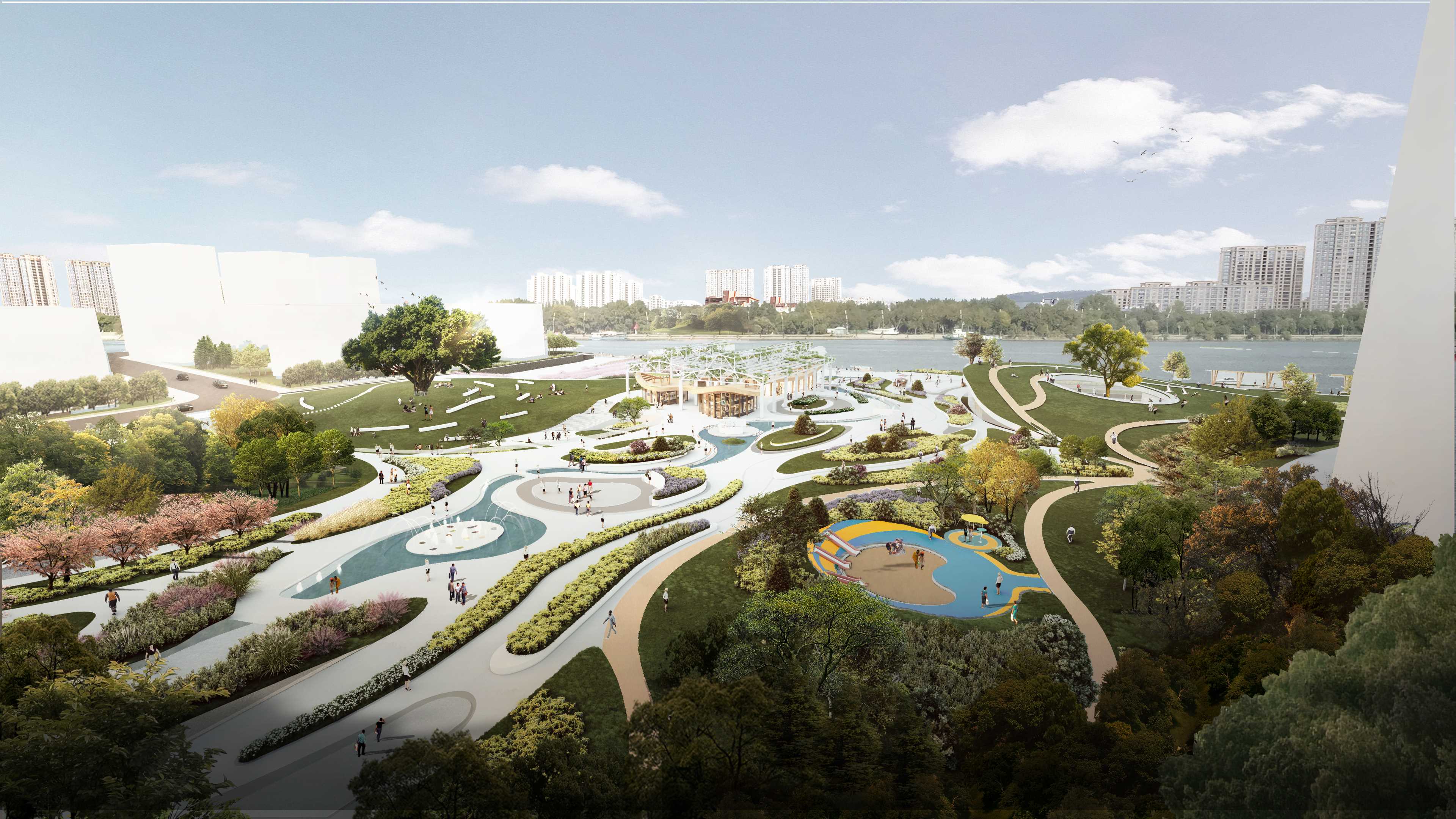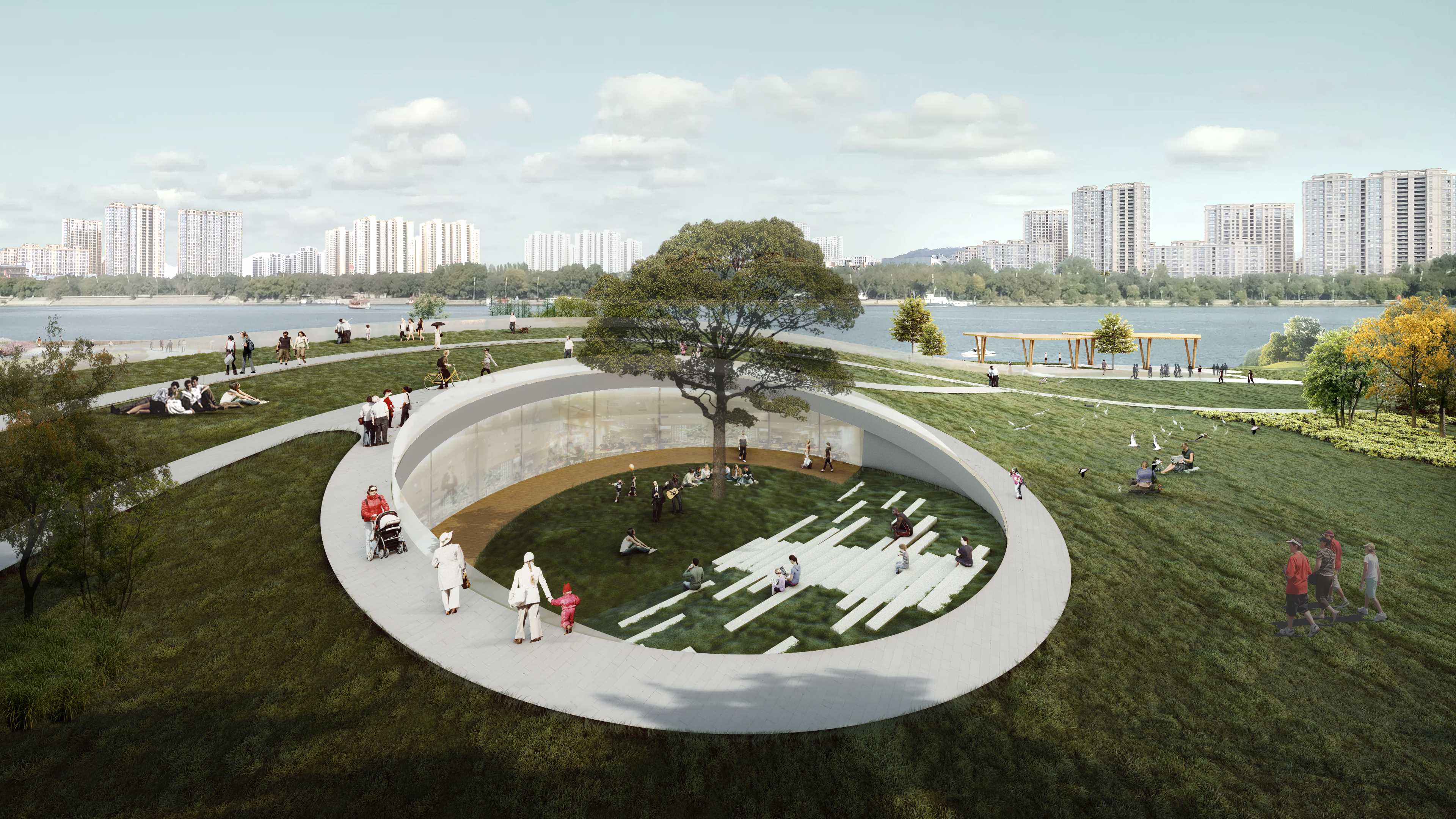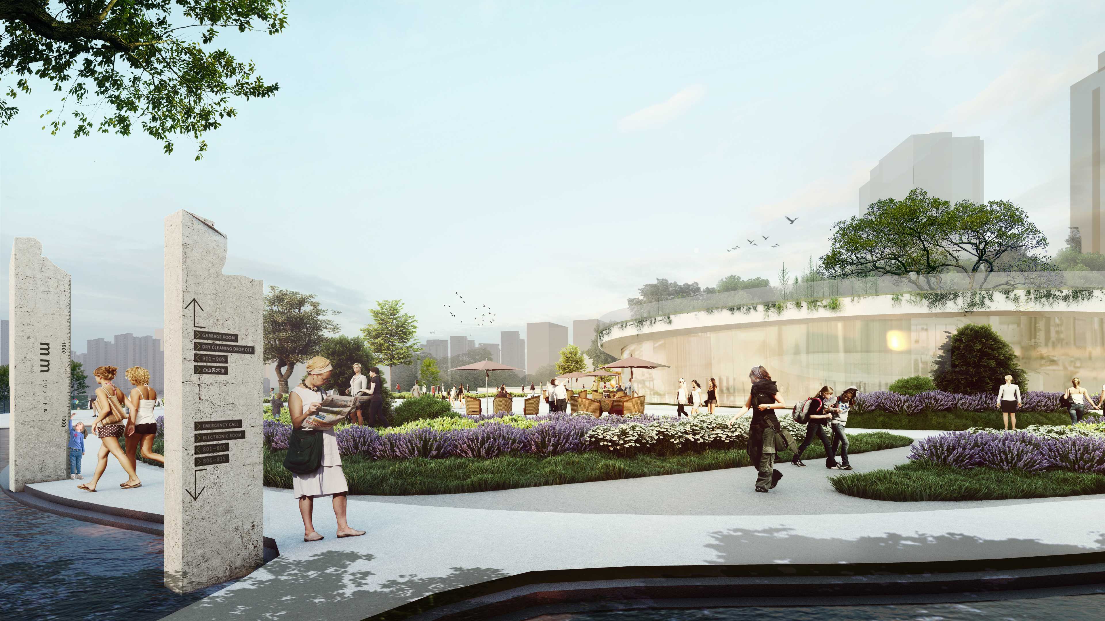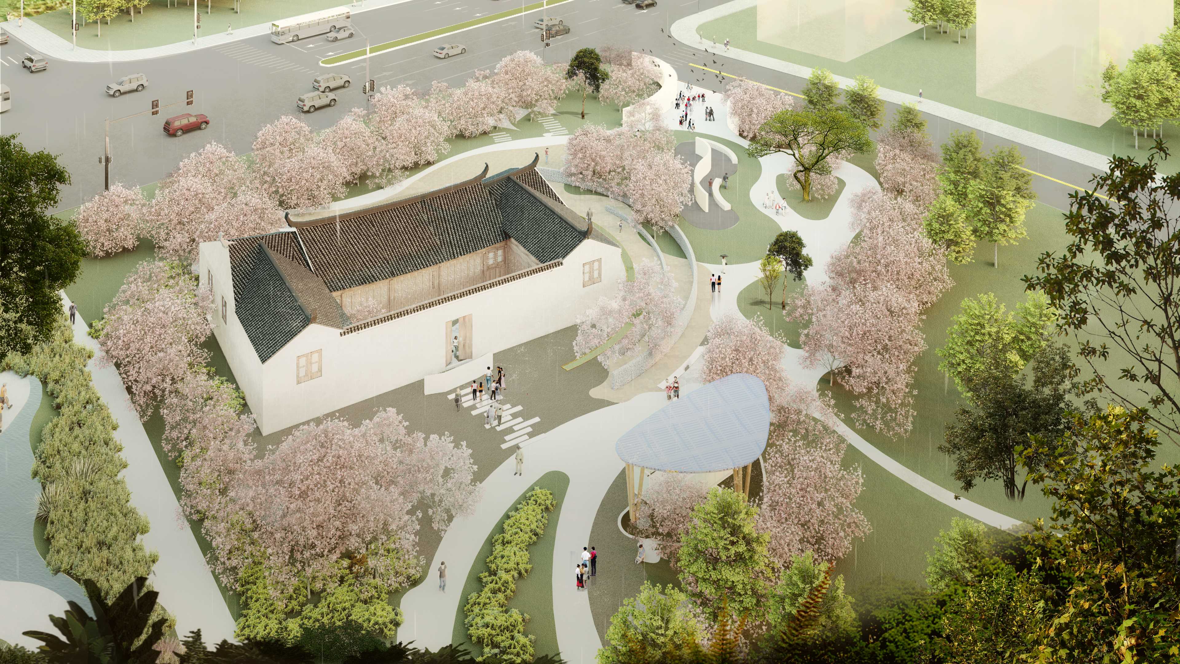 本次项目位于浙江省温州市瓯海区。设计区域自1939起一直以面砖加工制作为主。为温州近现代发展起到重要的作用。该地块北面背靠景山公园。南面为会昌河。地理环境优越。范围内还保存有百年大榕树和孙家老宅文物保护点。文化氛围浓厚。为推进西山面砖厂区域更新建设。优化片区配套设施。同时提升景山公园入口的城市形象。现将场地改造为工业遗址特色的城市公园。设计理念“串山连水”为出发点,原场地山水之势被钢筋水泥所阻断。若想将此处打造为景山南入口,并且引导塘河游玩和景山游玩的路线串联,需消除空间之阻断,恢复山水之连接,塑造城市之纽带。设计中我能保留了一组原厂房的结构桁架,通过融旧合新的方式,在恢复山水连接的同时,保留场地内有价值的工业遗存,结构优美的大厂房、标志性的高大设备等,以及古宅、古树等。将这些老旧物件赋予新的功能,融入新的场地环境。