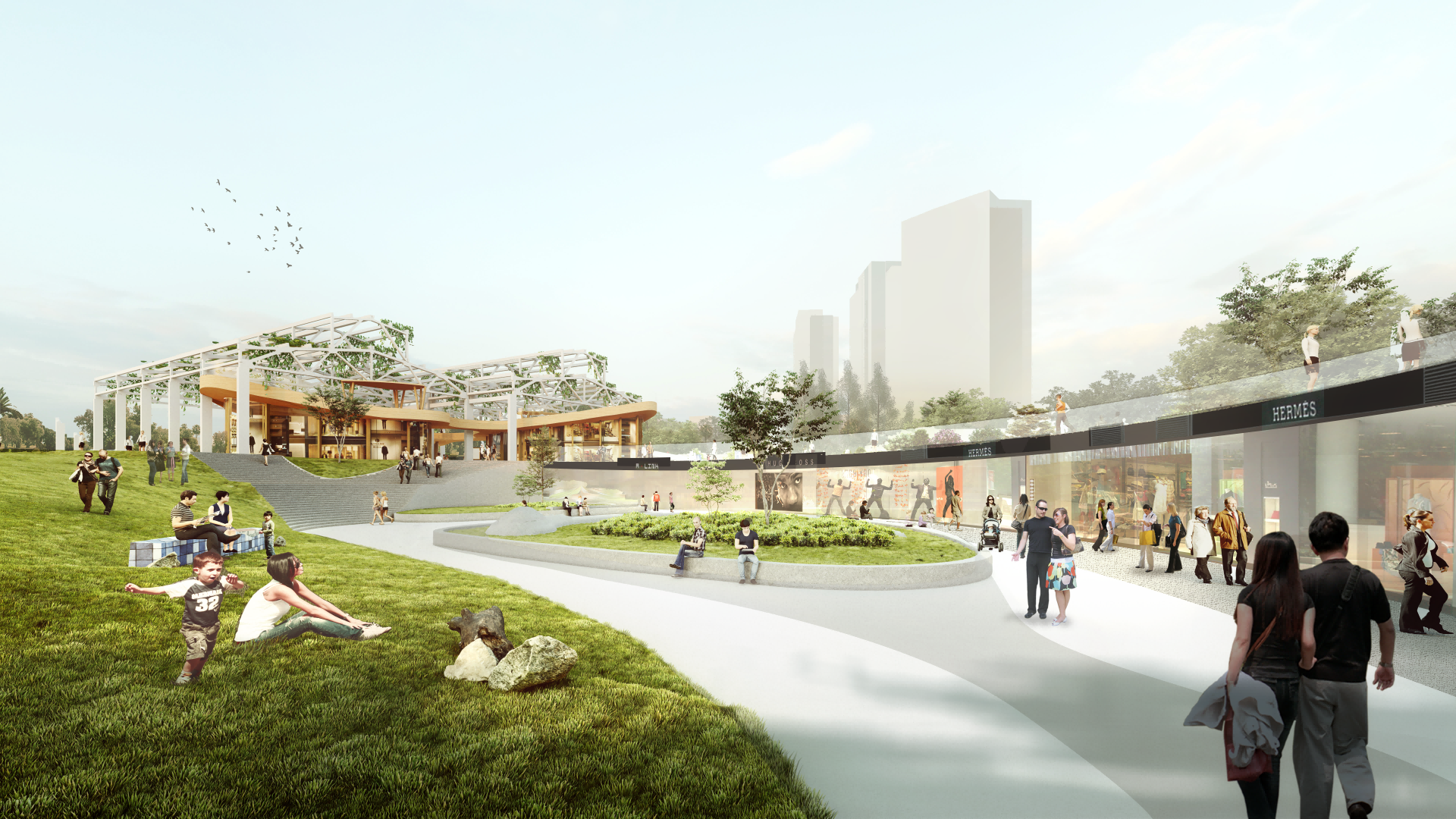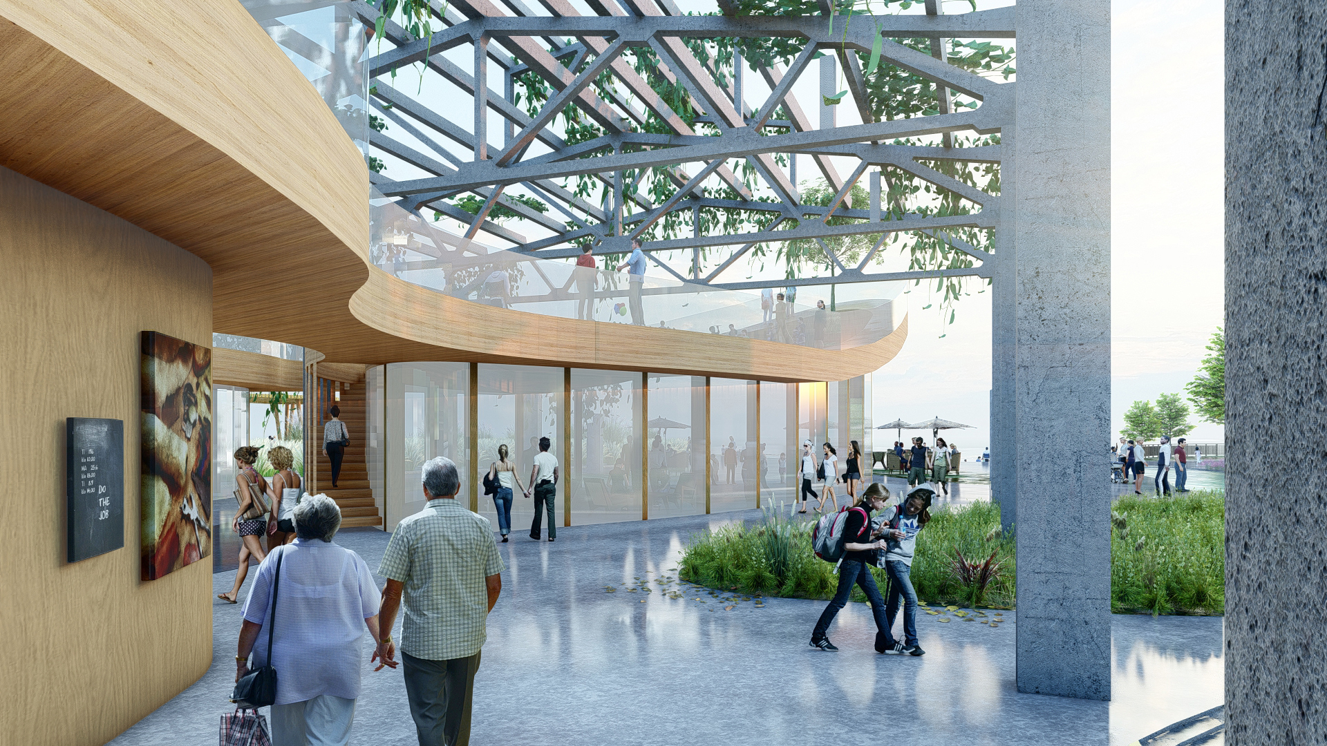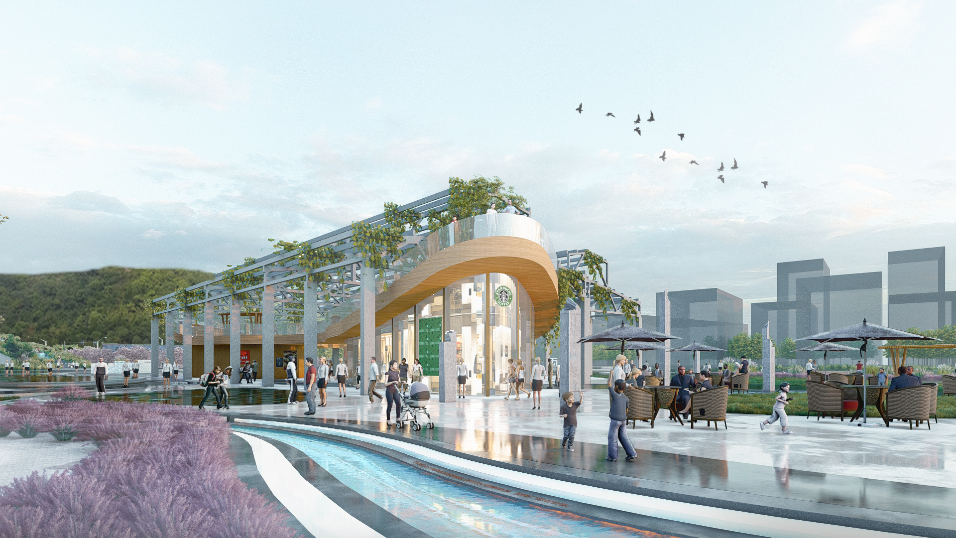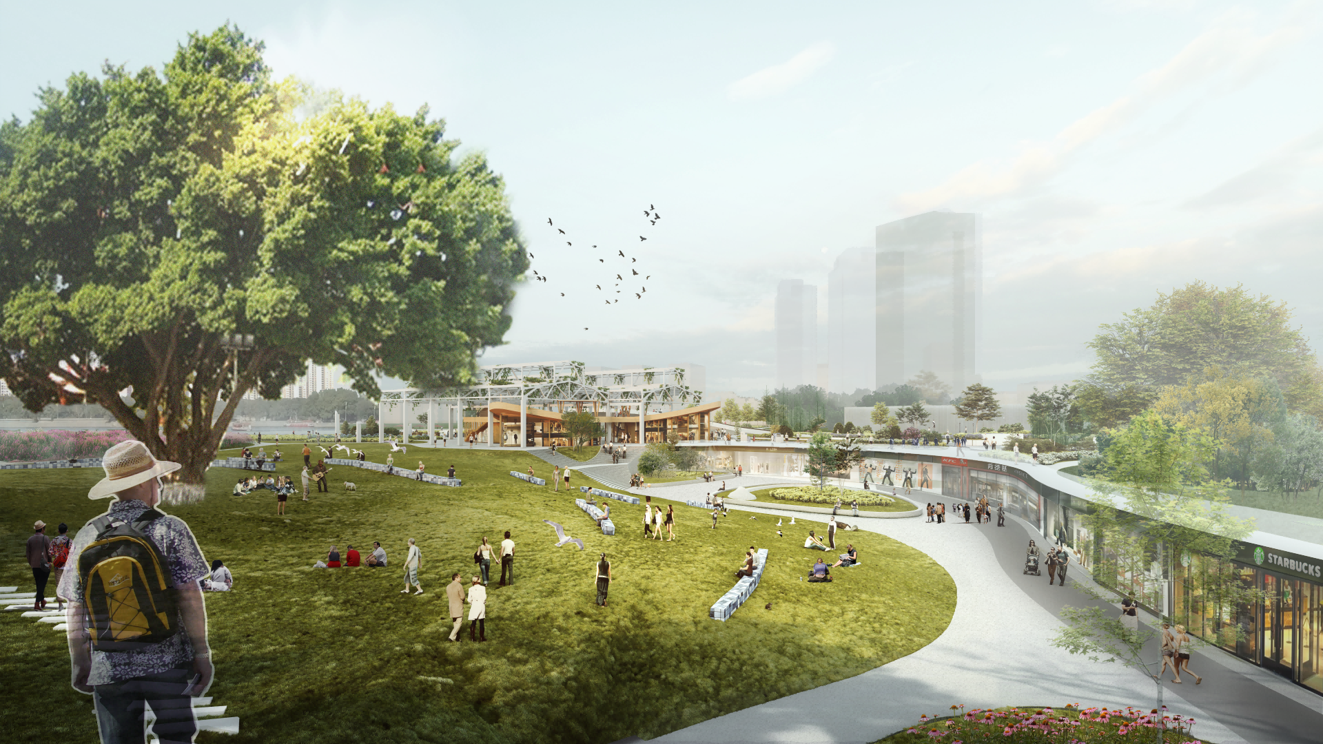 本次项目位于浙江省温州市瓯海区。设计区域自1939起一直以面砖加工制作为主。为温州近现代发展起到重要的作用。该地块北面背靠景山公园。南面为会昌河。地理环境优越。范围内还保存有百年大榕树和孙家老宅文物保护点。文化氛围浓厚。为推进西山面砖厂区域更新建设。优化片区配套设施。同时提升景山公园入口的城市形象。现将场地改造为工业遗址特色的城市公园。设计理念“串山连水”为出发点,原场地山水之势被钢筋水泥所阻断。若想将此处打造为景山南入口,并且引导塘河游玩和景山游玩的路线串联,需消除空间之阻断,恢复山水之连接,塑造城市之纽带。设计中我能保留了一组原厂房的结构桁架,通过融旧合新的方式,在恢复山水连接的同时,保留场地内有价值的工业遗存,结构优美的大厂房、标志性的高大设备等,以及古宅、古树等。将这些老旧物件赋予新的功能,融入新的场地环境。